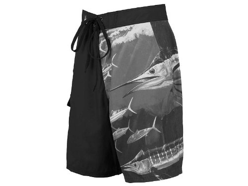 Stunning is the dramatic sublimated matching cross-seam Guy Harvey underwater sailfish graphic that wraps around the entire left leg of this fisherman's short. Made from quick-dry polyester micro suede for wear in and around the water. On the right side is a fisherman-friendly Cordura-lined pliers/utility pocket behind a large cargo pocket (with quick drain grommets and Guy Harvey signature). Other features include loose and baggy board short styling, a 21 length (9 inseam), two side-entry pockets, rear zippered pocket, triple-stitched seams for extra durability, and a fixed waistband with zipper and front tie for easy fit. Available in Black and Slate Blue; Sizes 30-42.